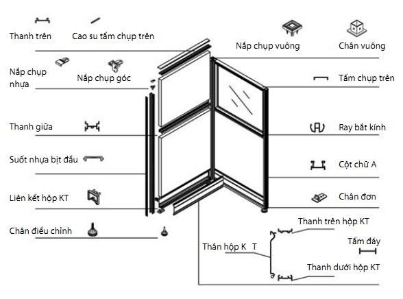 Một bộ vách ngăn nhôm kính cửa lùa thường bao gồm: